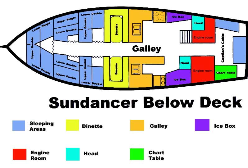 6'-4" headroom ---SLEEPS 20 in 5 CABINS - 9 double, 2 single